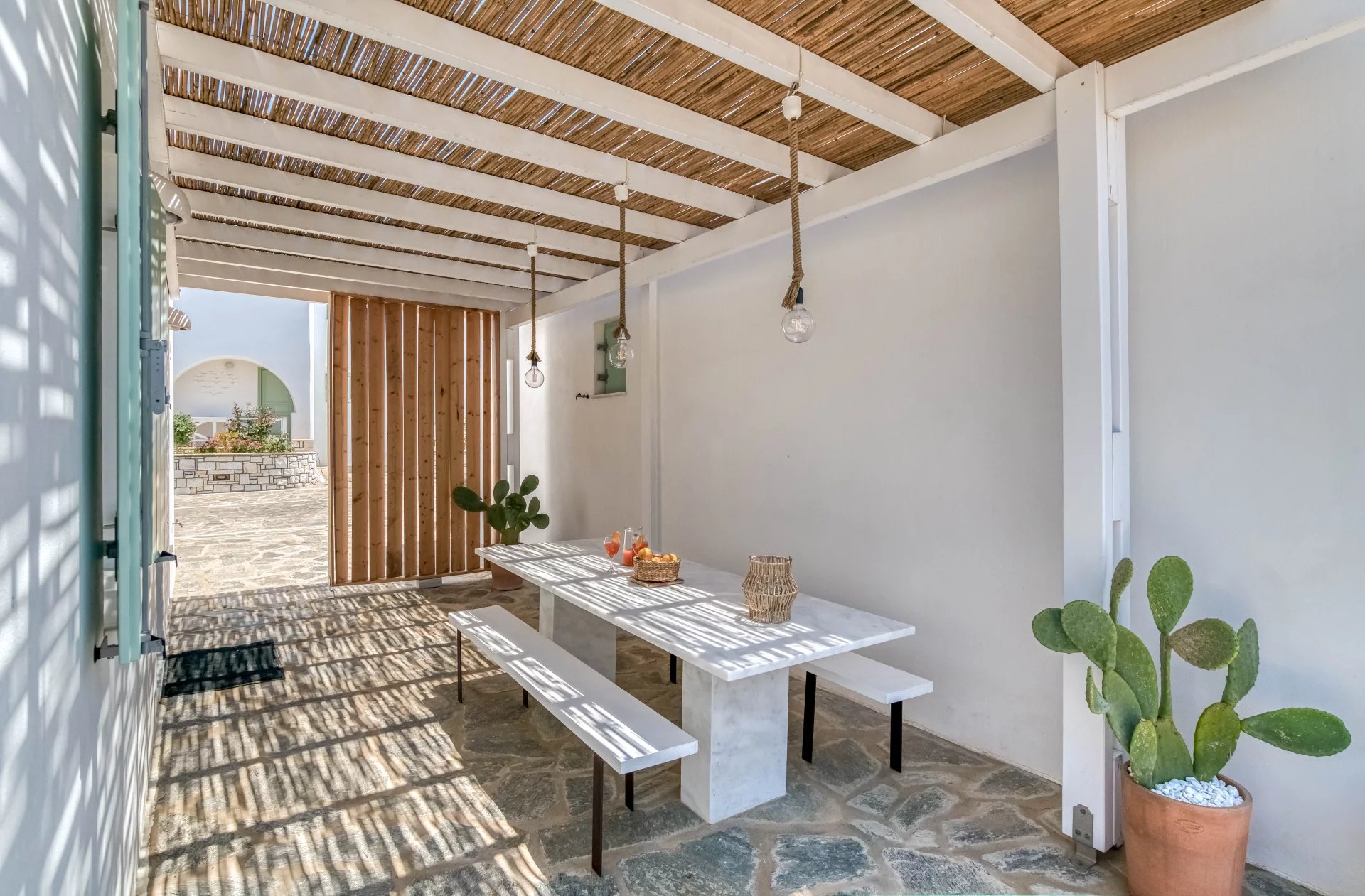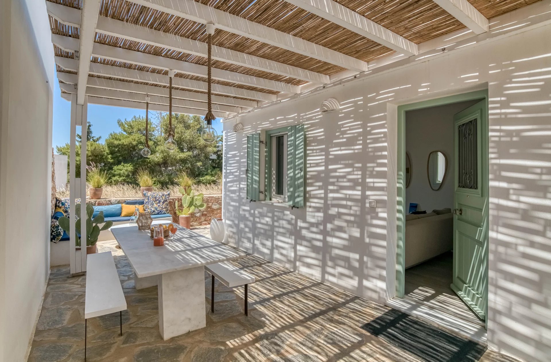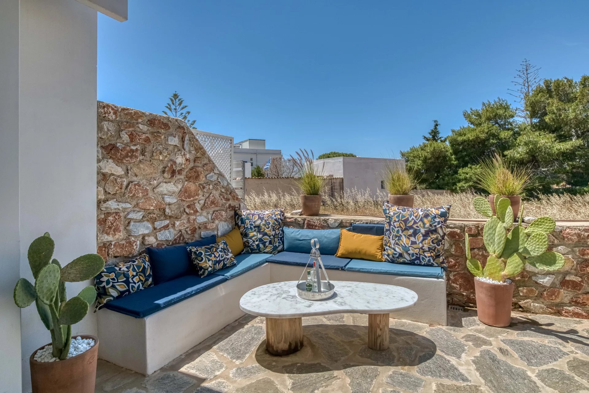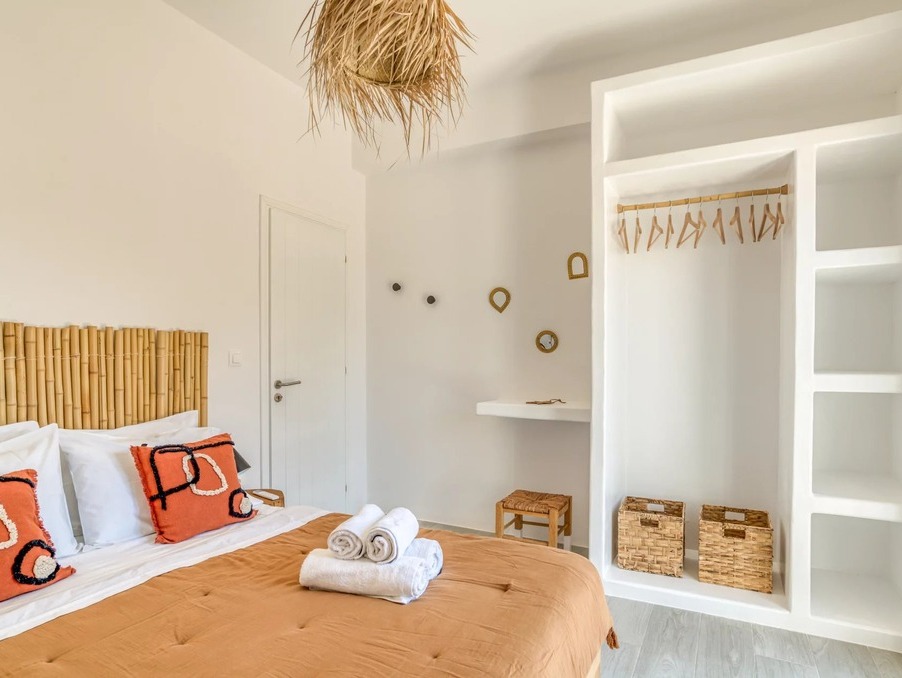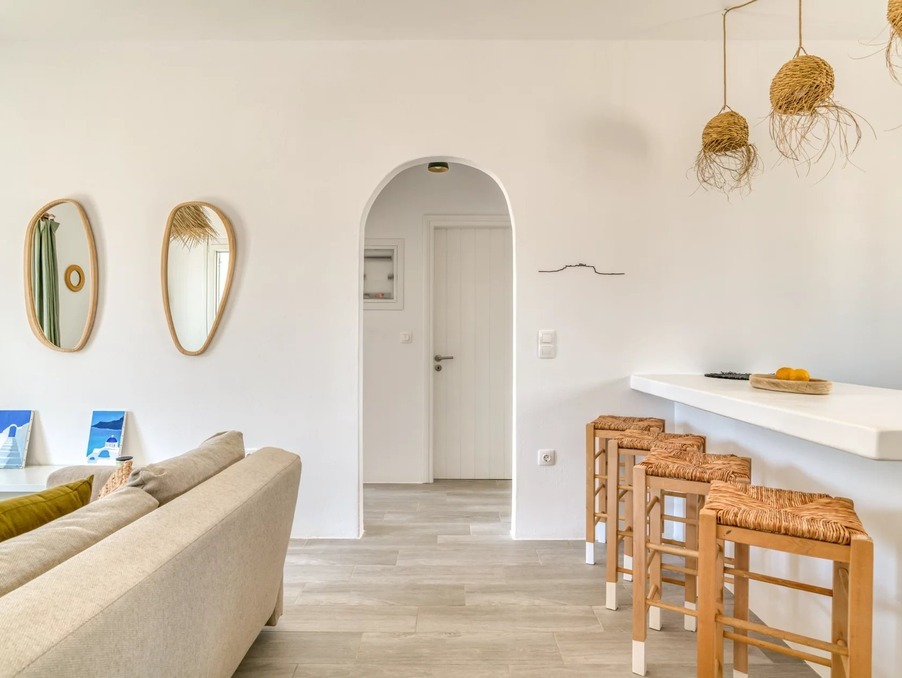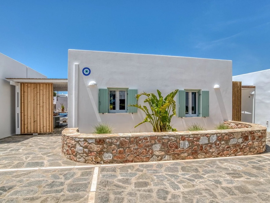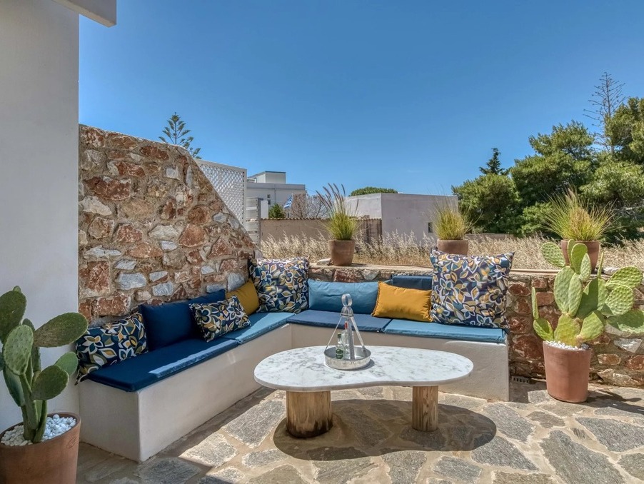 A l’extérieur, vous profiterez d’une terrasse spacieuse, d’un salon cycladique, d’une grande table en marbre de repas, de transats et d’une douche extérieure très appréciable en rentrant de la plage.