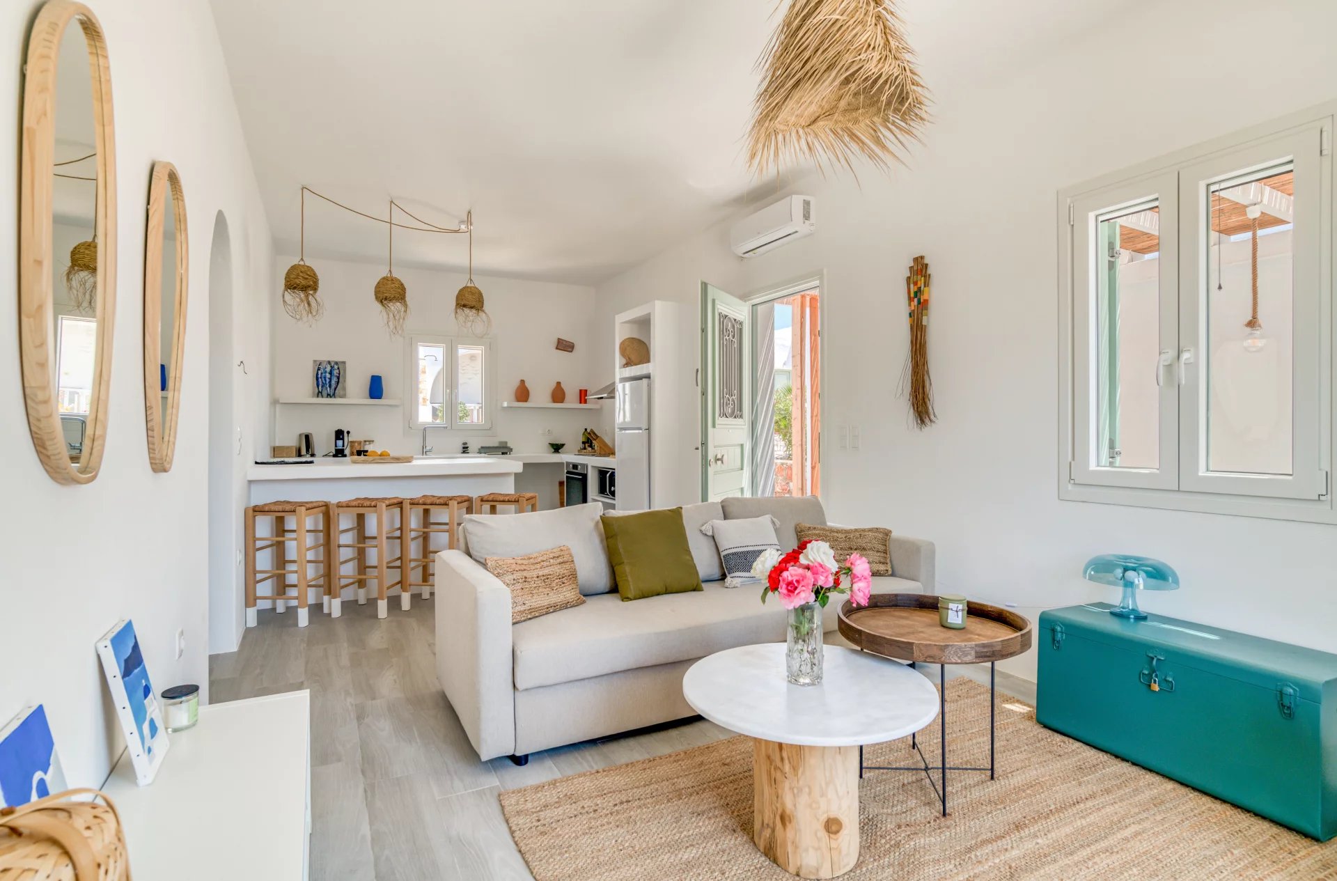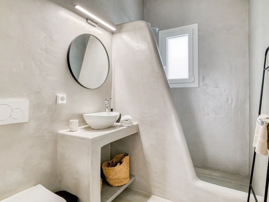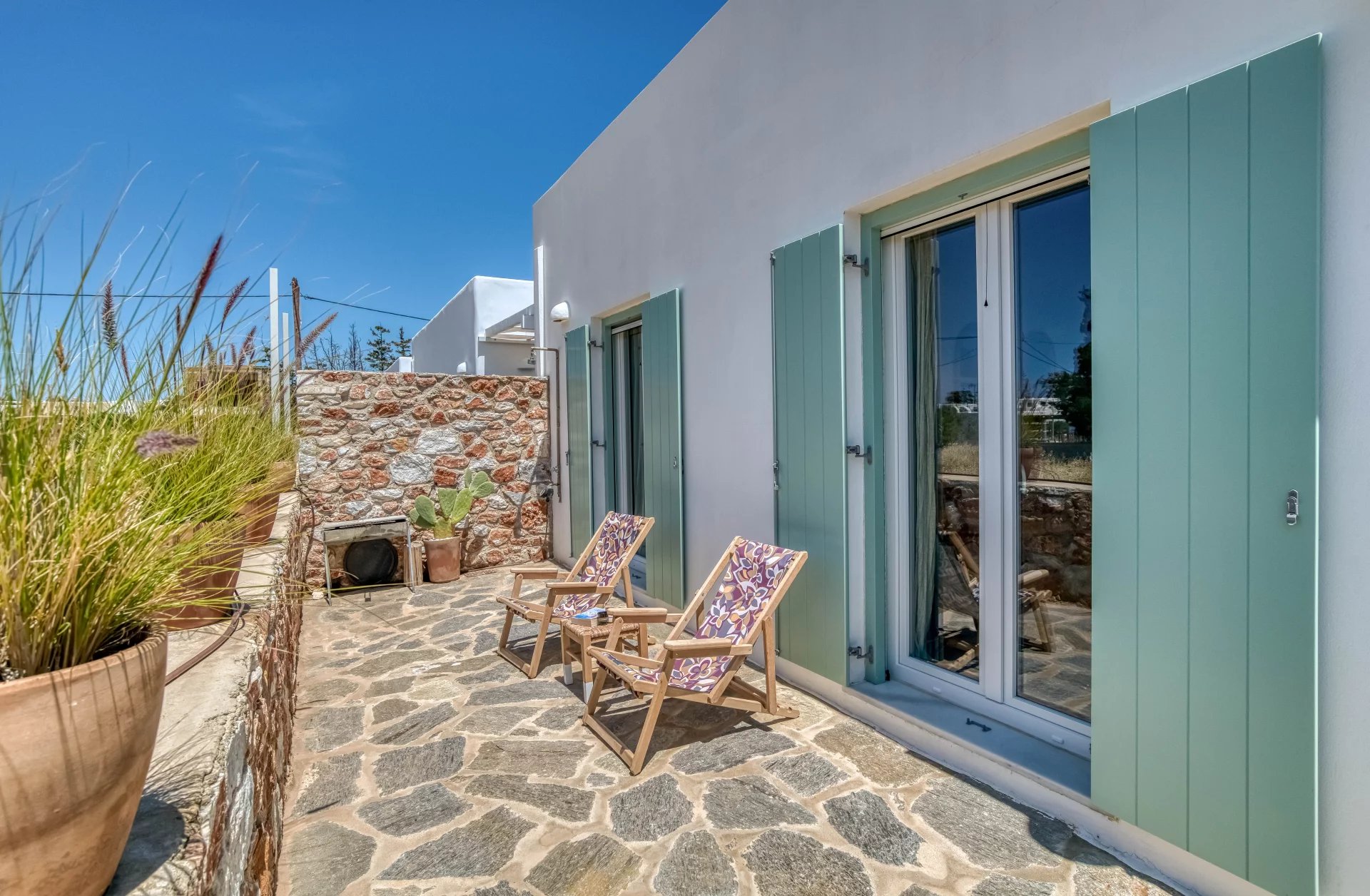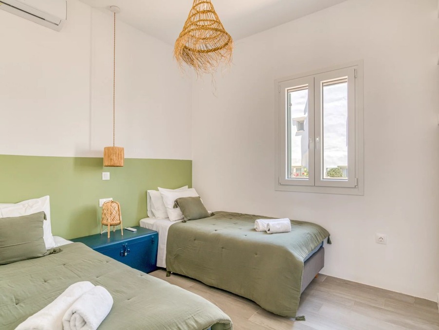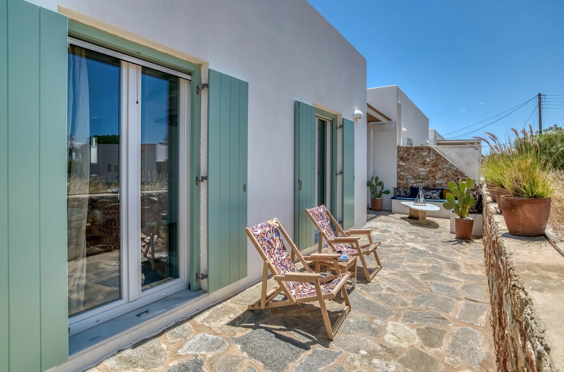 A l’extérieur, vous profiterez d’une terrasse spacieuse, d’un salon cycladique, d’une grande table en marbre de repas, de transats et d’une douche extérieure très appréciable en rentrant de la plage.