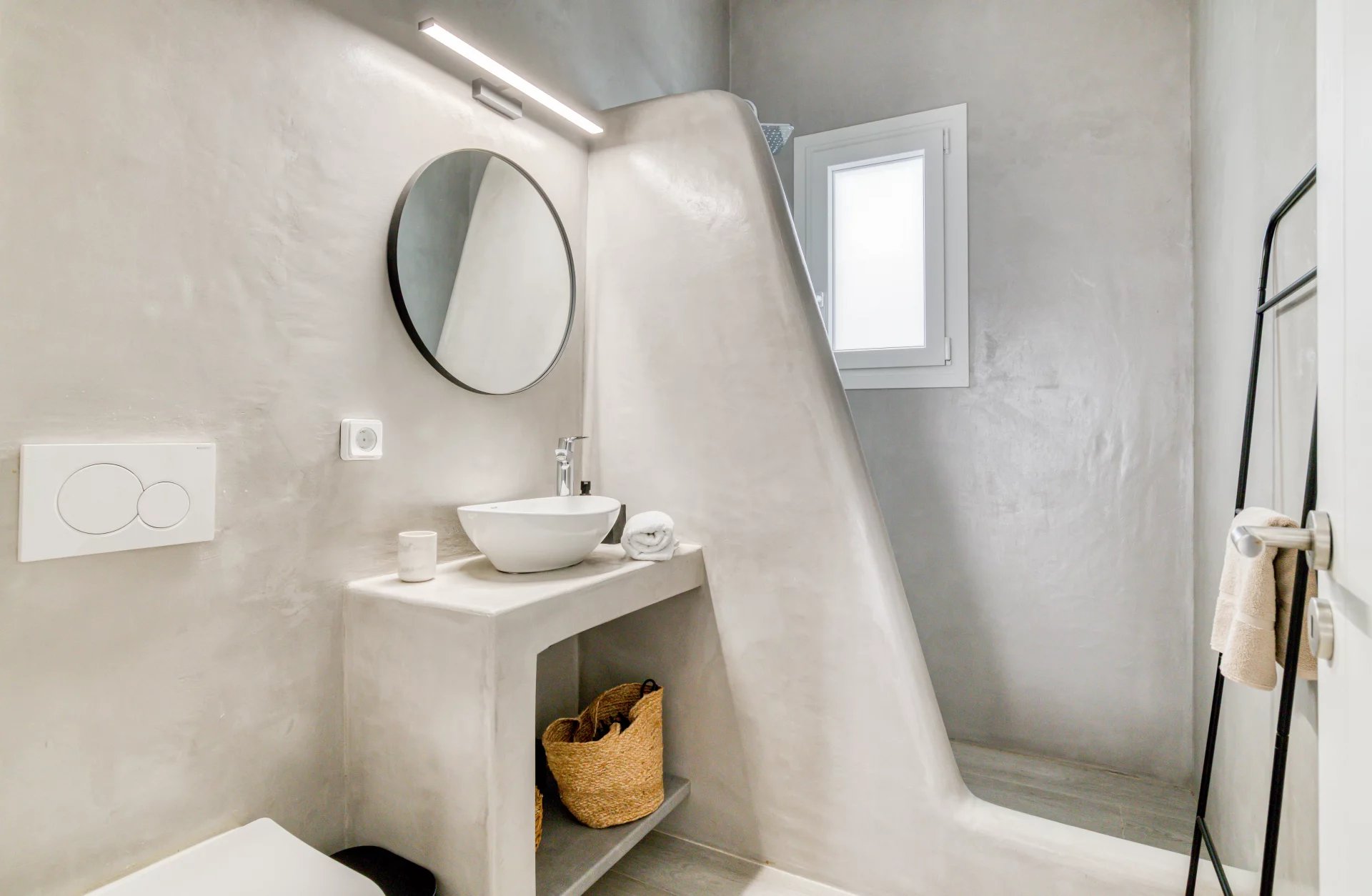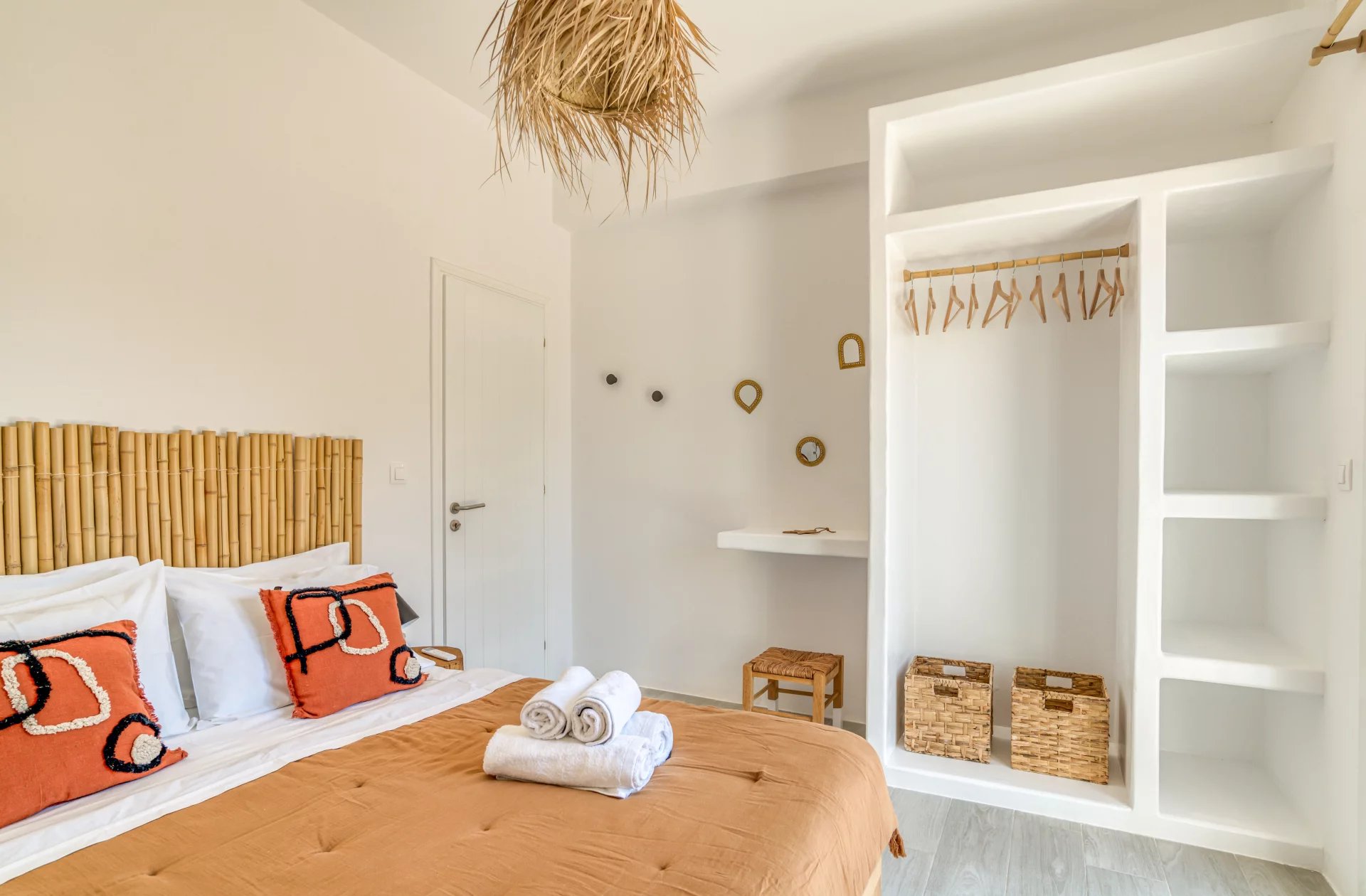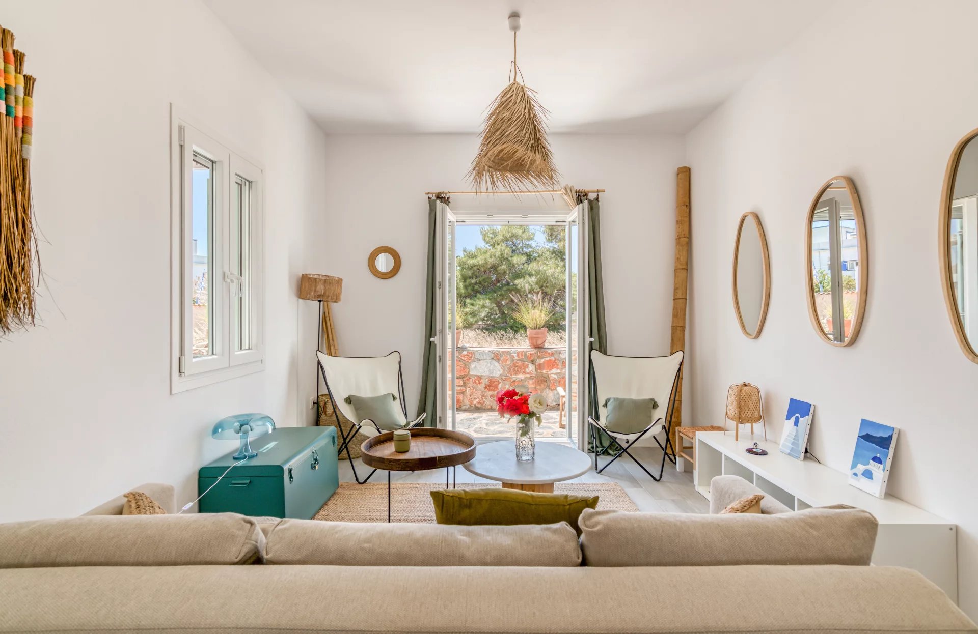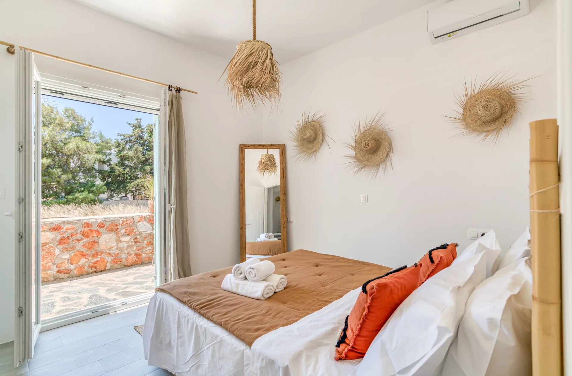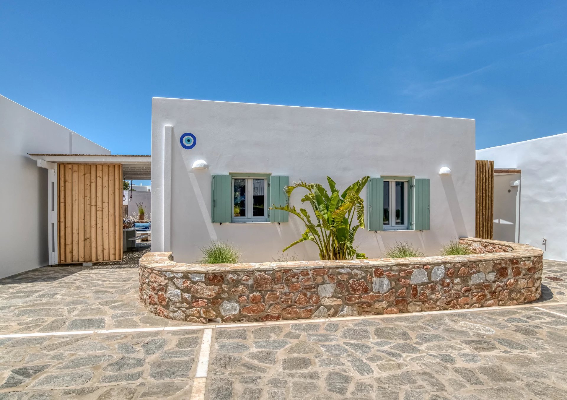 A l’extérieur, vous profiterez d’une terrasse spacieuse, d’un salon cycladique, d’une grande table en marbre de repas, de transats et d’une douche extérieure très appréciable en rentrant de la plage.