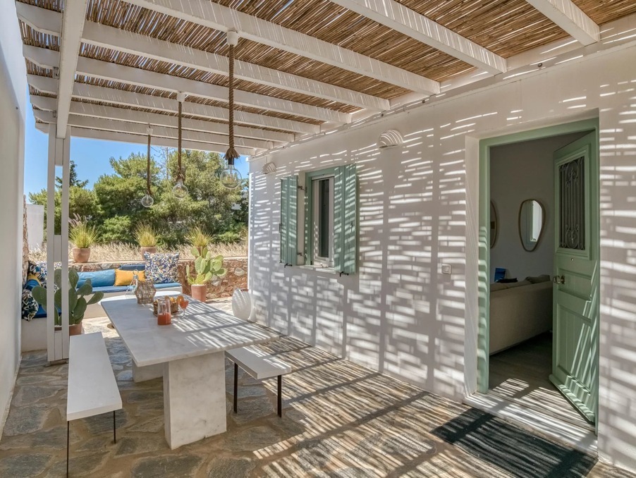 7 couchages - Située à 100 mètres de la jolie plage de sable de Logaras, Pisso Livadi, cette jolie maison cycladique de plein pied se compose d'une cuisine équipée ouverte avec salle à manger et salon...
