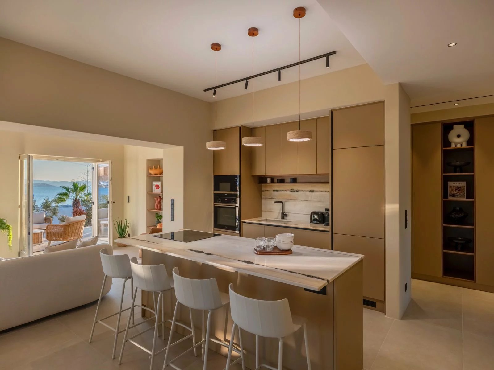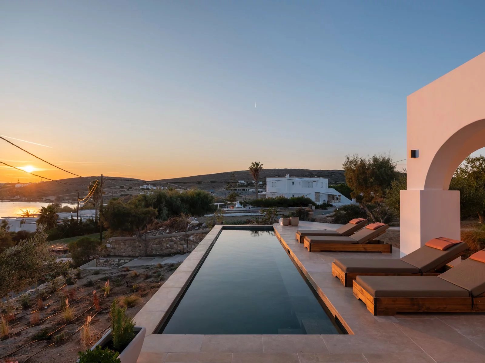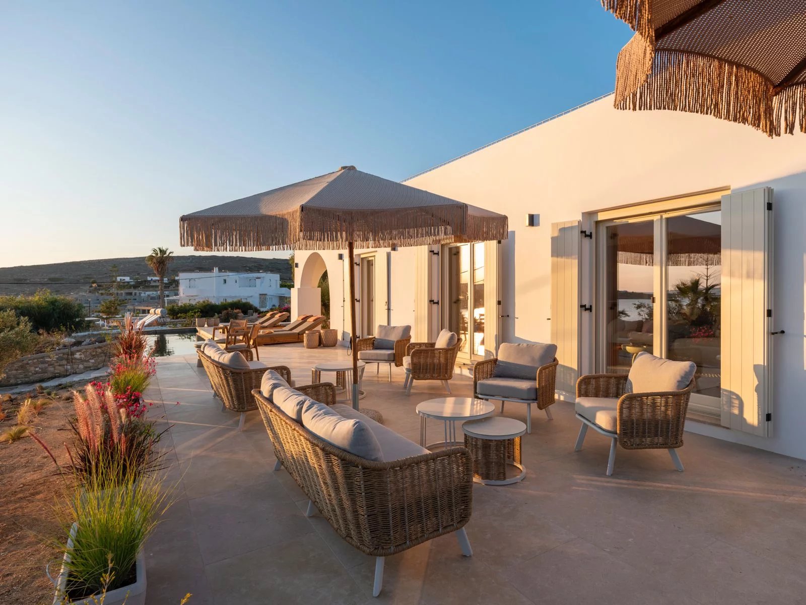 Les extérieurs se prolongent harmonieusement avec une piscine privée 8 × 2,5 m, plusieurs terrasses paysagées, des espaces lounge ombragés, ainsi qu’un roof garden offrant des couchers de soleil spectaculaires sur la baie de Parikia.