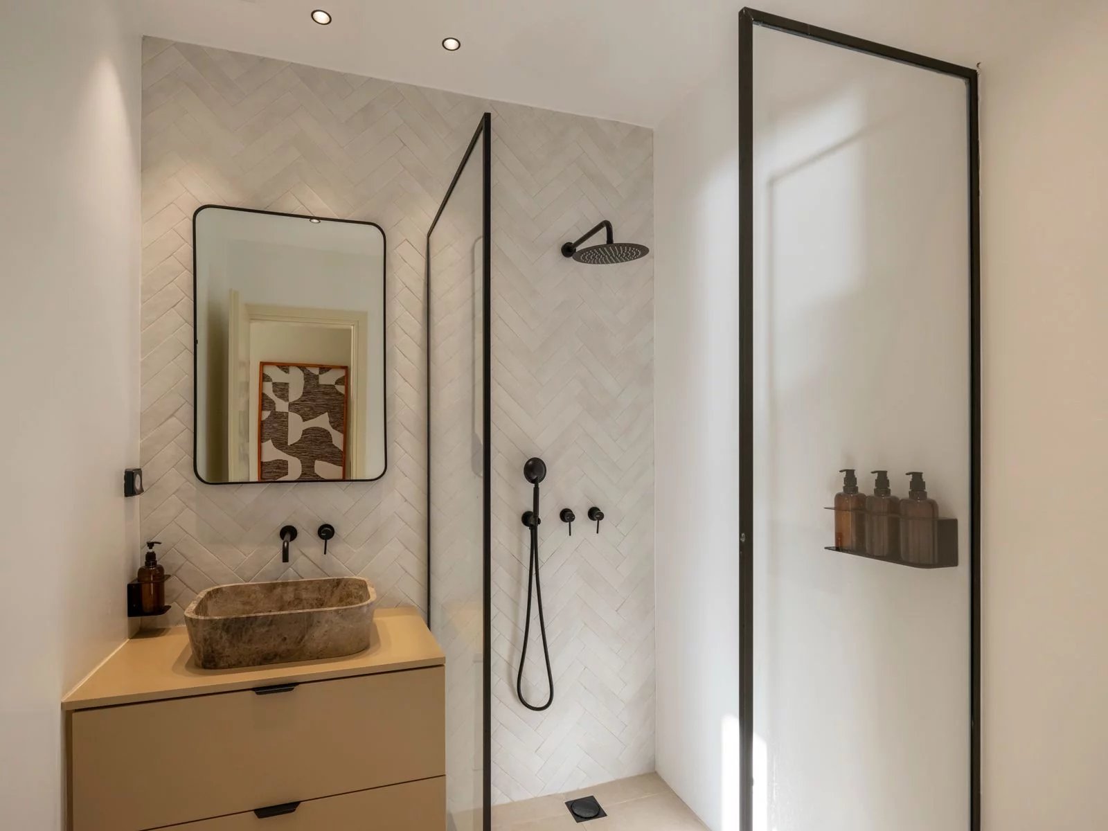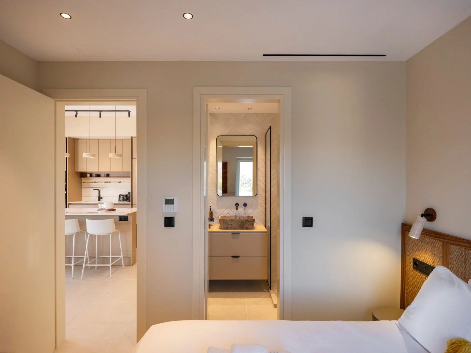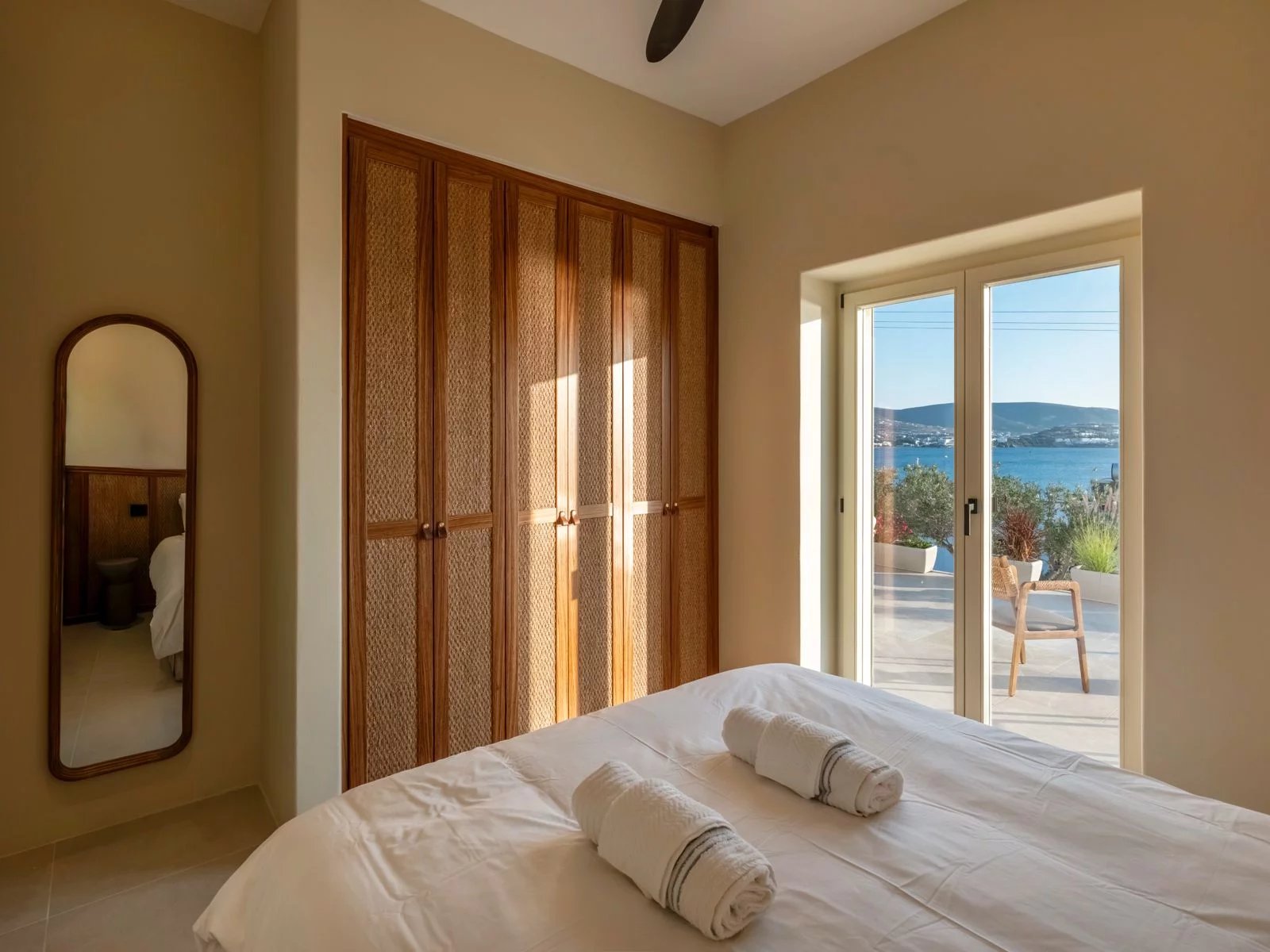 Les extérieurs se prolongent harmonieusement avec une piscine privée 8 × 2,5 m, plusieurs terrasses paysagées, des espaces lounge ombragés, ainsi qu’un roof garden offrant des couchers de soleil spectaculaires sur la baie de Parikia.