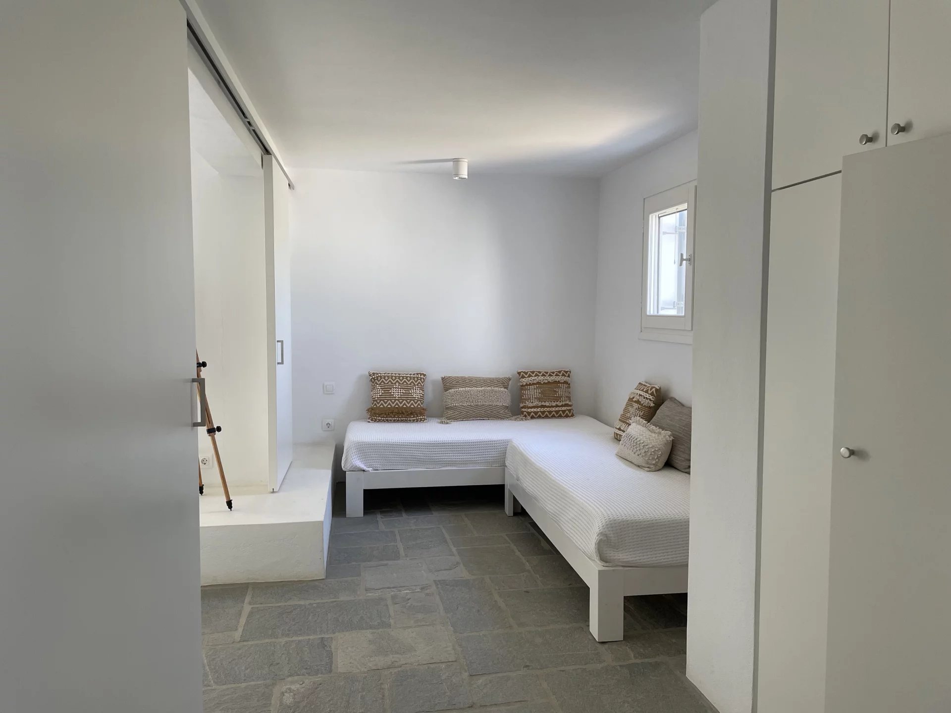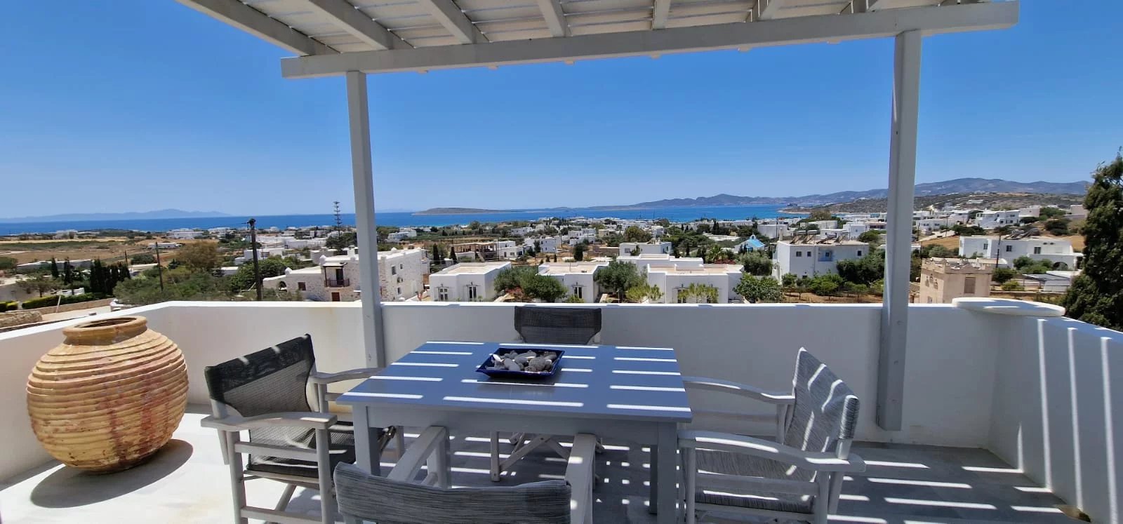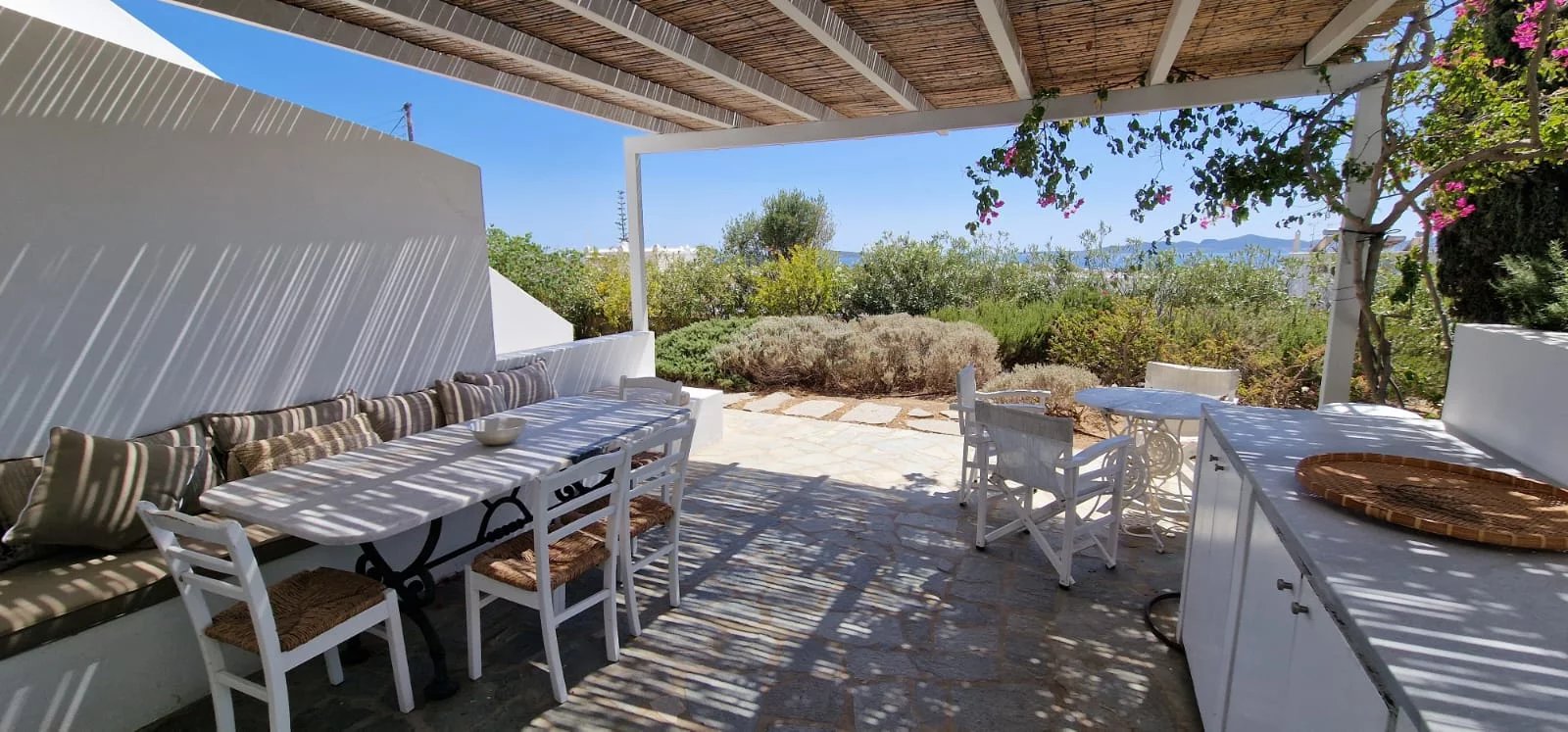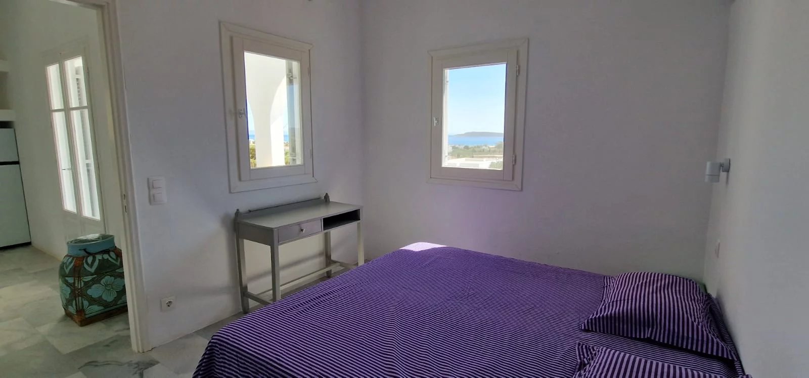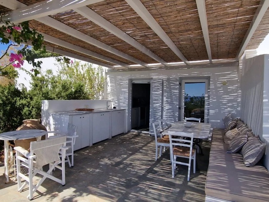 Située au-dessus du village d’Alyki, cette villa familiale entièrement rénovée de 250 m² offre une vue imprenable sur la mer et l’île d’Antiparos, notamment au coucher du soleil. Implantée sur un terrain clos de 2 520 m² planté d’oliviers, la propriété est idéale pour les grandes familles ou un investissement locatif.